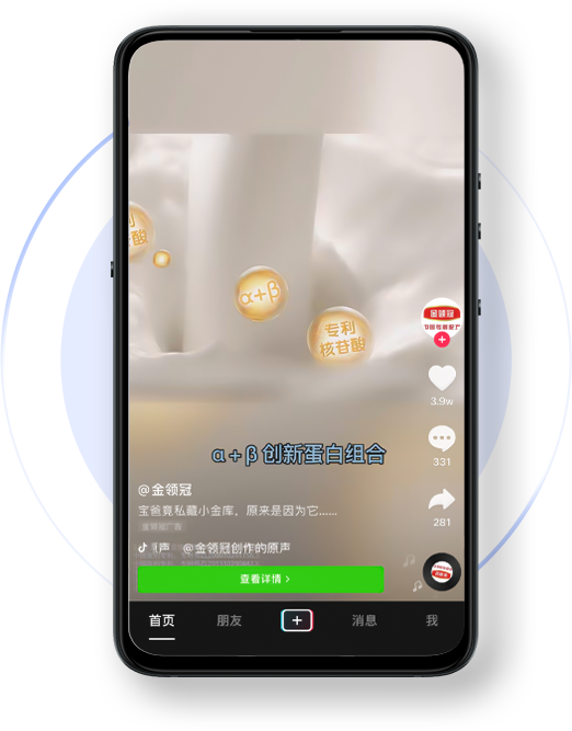广告展示在抖音信息流内容中,展现样式原生,竖屏全新